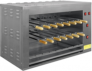 Гриль-шашлычница "Кебаб" электрический, настольный, с 8 рабочими шампурами предназначен для приготовления мясных, рыбных и овощных блюд приготавливаемых на шампуре или решетке (шашлык, кебаб и др.). Время разогрева - не более 10мин. Вместимость - 23 шампура, из них 8 шампуров на рабочем уровне (входят в комплект поставки) и 15 шампуров с электроприводом (в комплект поставки не входят). Гриль-шашлычница идеально подходит для приготовления мяса и других продуктов благодаря тщательно подобранным излучателям. Автоматическое вращение шампуров обеспечивает высокое качество приготавливаемых блюд, кроме того, высвобождает время повара, дает ему возможность заняться творческой составляющей процесса приготовления. Использование лотка для угля (в комплект не входит) добавит аромата приготавливаемым блюдам. Каждый ряд вращающихся шампуров имеет надежный независимый привод, а дополнительный ряд для размещения заготовок поможет сделать работу непрерывной. Гриль-шашлычница прост в обслуживании и уборке, съемный поддон-жиросборник позволяет всегда содержать аппарат в чистоте. Корпус гриля изготовлен из нержавеющей стали.
