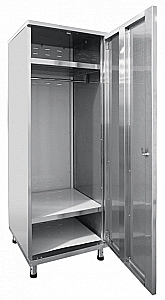 Одностворчатый, полностью разборный. Две сплошные полки, перекладина для вешалок. Материал изготовления - нержавеющая сталь. Регулируемые по высоте ножки.