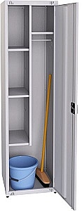 Прочная конструкция каркаса выполнена из стального листа. В нижней части шкафа специально предусмотрено место для размещения хозяйственного инвентаря – ведра, швабры и т.д. В левой части шкафа 3 полки, две из которых переставляются по высоте. В правой - полка и два крючка. Дверь закрывается на 3-х сторонний ригельный замок.