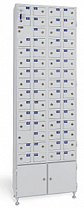 Шкаф на 58 индивидуальных ячеек. Ячейки пронумерованы. Каждая ячейка открывается отдельным замком «EURO-LOCKS». Шкаф укомплектован бирками для ключей. Внизу две большие ячейки,каждая закрывается отдельным замком. Предусмотрены резьбовые регулировочные ножки.
