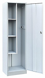 Шкаф для хозинвентаря позволяет с удобством хранить предметы различного назначения. Для этого внутри предусмотрены три полочки, держатель для швабры, крючок и перекладина для спецодежды. Конструкция цельносварная, что придает шкафу дополнительную жесткость и не требуется сборка.