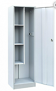 Шкаф для хозинвентаря позволяет с удобством хранить предметы различного назначения. Для этого внутри предусмотрены три полочки, держатель для швабры, крючок и перекладина для спецодежды. Конструкция цельносварная, что придает шкафу дополнительную жесткость и не требуется сборка.