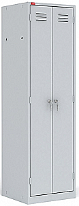 Шкаф металлический разборный двухсекционный, повышенной жесткости для хранения сменной одежды. В каждом отделении: полка для головного убора, перекладина для вешалки и крючки для одежды, индивидуальный врезной замок.