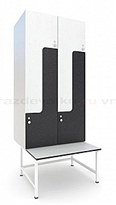 Шкаф на скамейке с регулируемыми опорами. Высота скамейки 420 мм, ширина сиденья 350 мм. Используемые петли Boyard (Боярд) угол открывания 105°. Толщина материала 16 мм. Вентиляционные отверстия D 20 мм, хромированная штанга для вешалки или двойной крючок. Высота ножек 100 мм., диапазон регулирования -+ 30 мм. Пластиковая куполообразная ручка подойдет к любым фасадам. Из широкой цветовой гаммы можно легко подобрать необходимый оттенок, размер ручки H 25 мм, D 30 мм. В комплектацию входят механические замки Boyard (Боярд) или EuroLock (Евролок), два комплекта ключей на каждый замок. При облицовке используется пластик HPL. Влагостойкий.