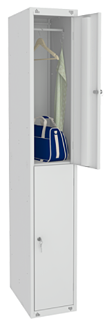 Каждая секция шкафа оснащена полкой под головной убор, перекладиной под "плечики", двумя крючками и замком. Дополнительно можно приобрести: полки, замки повышенной секретности.