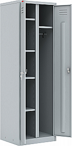 Шкаф металлический двухсекционный ШРМ-22У 1860х600х500 мм. В одной секции полка для головного убора, перекладина для вешалки и крючки для одежды, в другом четыре регулируемые по высоте полки.