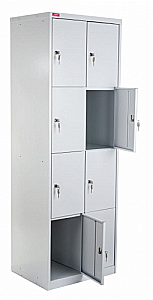 Cостоит из восьми секций, что делает модель пригодной для использования в раздевалках или на входе в магазины. Используются для хранения пакетов и сумок в крупных магазинах, личных вещей в раздевалках спортклубов и фитнес-центров. Конструкция изделия оснащена дополнительными ребрами жесткости, что обеспечивает длительный срок службы. Размеры секции достаточны для размещения внутри даже спортивной сумки. Индивидуальный ключевой замок решает проблему безопасности.