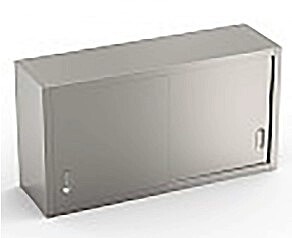 Настенный шкаф с раздвижными дверцами из нержавеющей стали AISI 304. Подвижная промежуточная полка, которую можно расположить на трех разных уровнях, опорную конструкцию необходимо закрепить на стене с помощью прилагаемых монтажных кронштейнов.
