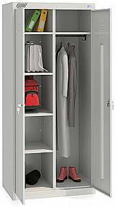 Шкаф ШМУ 22-800 для хранения одежды и личных вещей, имеет две отдельные секции, каждая секция закрывается отдельно. Одна секция оснащена полкой для головного убора, двумя крючками для одежды, перекладиной для вешалок, вторая секция оснащена 4-мя переставными полками, шаг регулировки полок по высоте шкафа - 40 мм.