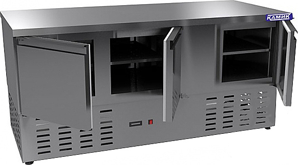 Морозильный стол КАМИК СМ-40208Н используется на предприятиях общественного питания и торговли для заморозки и длительного хранения продуктов, полуфабрикатов и мороженого. Конструкция разделена на секции, каждая из которых оборудована сетчатой полкой и парой направляющих. Корпус выполнен из нержавеющей стали AISI 430 толщиной 1 мм, столешница - из нержавеющей стали AISI 304 толщиной 1,5 мм.