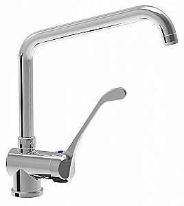 Смеситель Rubinetterie DEL FRIULI DEL FRIULI Mixer tap H //00208223 предназначен для ежедневного использования и подачи воды на кухнях в пекарнях, столовых, кафе, ресторанах и на других предприятиях общественного питания. Смеситель устанавливается на моечную ванну или на стол-мойку. Модель оснащена литым поворотным гусаком и кулисой из черного пластика. Смеситель выполнен из хромированной латуни.