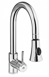 Cмеситель с одним отверстием H = 370 мм с качающейся струей и выдвижным душем подходит для использования в домашних условиях
