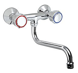 Кран на два отверстия для настенного крепления. С S-образным изливом. Конструкция двухвентильный. Длина излива 220. Высота излива 125 мм