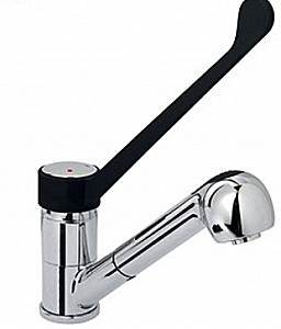 Кран-смеситель на одно отверстие с выдвижным душем и маленьким удлиненным рычагом из пластика.