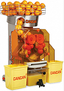 Соковыжималка для апельсинов CANCAN 38 FRESH — позволяет выжимать сок из апельсинов, мандаринов, грейпфрутов или лимонов. Используется в кафе, ресторанах, точках по продаже свежевыжатых соков, смузи или фруктов, а также на пищевых производствах и на торговых предприятиях. Принцип действия автоматических соковыжималок следующий: из загрузочного бункера (корзины), фрукты попадают на отжимные барабаны, где делятся на половинки ножом и выжимаются с помощью отжимных кулачков. Кожура сбрасывается в емкость внутри корпуса. Автоматические соковыжималки обеспечивают увеличенный выход сока — до 50% от веса фрукта. CANCAN 28 комплектуется загрузочной корзиной емкостью 15 кг. и бункером для кожуры емкостью 15 кг. Спиральная дорожка вмещает 6-8 плодов. Удобный монтаж-демонтаж позволяет легко мыть части машинки. Корпус и поддон выполнены из нержавеющей стали. 5-литровая емкость оснащена краном для дозированной подачи сока.