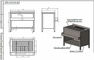 Столешница- металл AISI 304, профиль 40х40, борт 50 мм сзади, 1 сварная теплоизолированная мойка 900х445х300, без отверстия под смеситель, с двумя перфорированными вставками и четырьмя объёмными съемными разделителями, фартук передний, полка-дно 500мм на высоте 200мм от пола, передний рейл для бутылок (съёмный), закрыта с 3-х сторон, предусмотрен лоток 560х230 (фиксируется отгибами на разделители), предусмотрена перфорированная вставка в лоток, предусмотрен сгон 3/4", неразборная