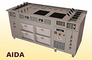 Встроены различные модули для приготовления пасты, овощей, всевозможных блюд итальянской кухни: электроварка с корзинами, мармит тепловой, холодильный модуль, индукционная плита.