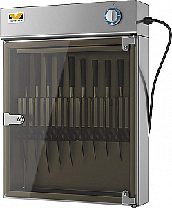 Стерилизатор для ножей т.м. Vortmax серии KS, мод. KS 18, 450х145х605 мм, ртутная лампа низкого давления ДРБ 8-1, максимальное количество ножей - 18 шт., климатический класс: +5 до +55С, 220В, можность лампы 8Вт. Предусмотрено размещение ножей на решетке-держателе или нержавеющей магнитной планке, в зависимости от необходимости можно пользоваться любым способом.