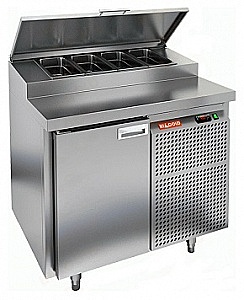 В верхней части стола устанавливаются гастроемкости 1/3 GN, глубиной 100 мм максимум, глубина рабочей части столешницы 324 мм., выполнен полностью из нержавеющей стали марки AISI 304, 1 распашная дверь.