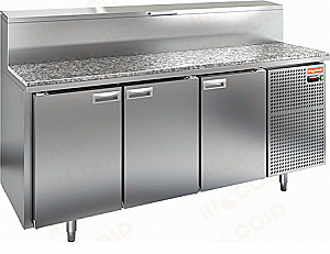 В верхней части стола устанавливаются гастроемкости 11х 1/6 GN глубиной 100 мм максимаум, глубина рабочей части столешницы 486 мм выполнена из камня, 3 распашные двери
