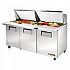 Преп-стол для бургеров TRUE TSSU-72-30M-B-ST оснащен разделочной доской шириной 226 мм, 3 двери, 6 полок ( размер полок 548 х 407 мм). Вмещает 30 гастроемкостей GN1/6 в топовую зону для ингредиентов. Температурный режим от +0,5 до +5°С. Конструкция из нержавеющей стали. Хладагент R134A