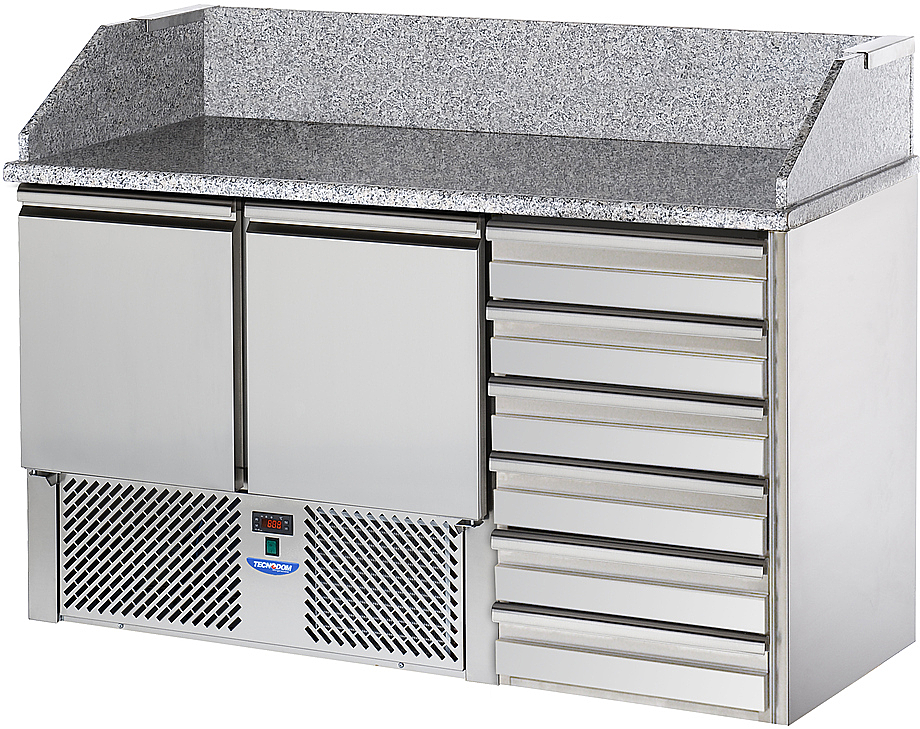 Стол для пиццы Tecnodom SLV02C6 используется на предприятиях общественного питания и торговли для раскатки теста и обработки ингредиентов, используемых для приготовления пиццы, салатов и других блюд, а также для охлаждения и кратковременного хранения скоропортящихся продуктов и напитков. Модель оснащена электронной панелью управления с NTC датчиком, столешницей с бортом и 6 нейтральными ящиками с контейнерами из полипропилена. Корпус, за исключением агрегатного отсека, выполнен из нержавеющей стали, столешница - из гранита, теплоизоляция - полиуретан, впрыскиваемый под высоким давлением.