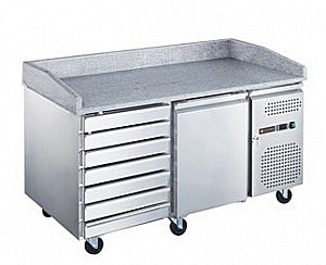 515x800x1000 мм, 220В, 0,215 кВт, 390 л, -2…+8 C, каменная столешница с 3 бортами, 1 дверь + 7 ящиков, ящики без охлаждения, полка 600х400, одна полка в комплекте, боковое расположение холодильного агрегата, динамическое охлаждение, на колесах