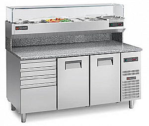 Стол холодильный для пиццы GEMM SMR/16C серии NEW SMART предназначен для раскатки теста, обработки ингредиентов для приготовления пиццы, охлаждения и кратковременного хранения скоропортящихся продуктов и напитков на предприятиях общественного питания и торговли. Модель оснащена охлаждаемой витриной для контейнеров на гранитном бортике со стеклянной крышкой и цифровым термостатом. Столешница выполнена из гранита.