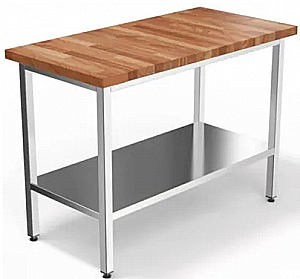 Столешница из бука: Натуральное дерево обладает высокой прочностью, износостойкостью и приятной текстурой. Бук устойчив к механическим воздействиям, что делает его идеальным для работы с тестом, шоколадом и другими кондитерскими изделиями.