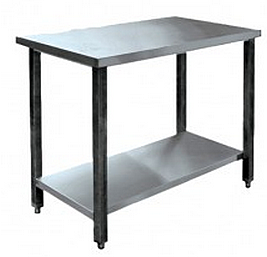 Выполнен полностью из нержавеющей стали. Разборный каркас из квадратной трубы с полкой имеет очень прочную конструкцию, которая выдерживает большие нагрузки, что является гарантией долгого срока эксплуатации. Для удобства ножки стола островного Abat СПРО-7-7 с резиновыми вставками регулируются по высоте. Допускаемая нагрузка на столешницу: 100 кг. Допускаемая нагрузка на нижнюю полку: 50 кг.