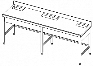 Количество полок: нет. Неразборный, борт спереди и сзади, борт спереди загнут наружу (30х15х10 мм), отверстия сзади: слева 290х142 мм, в центре 448х142 мм, справа 290х142 мм, в связи с тем, что поверхность стола заматована, обвязка с 3-х сторон, фартуки с 4-х сторон, нержавеющая сталь AISI 430, профиль 40х40 мм.