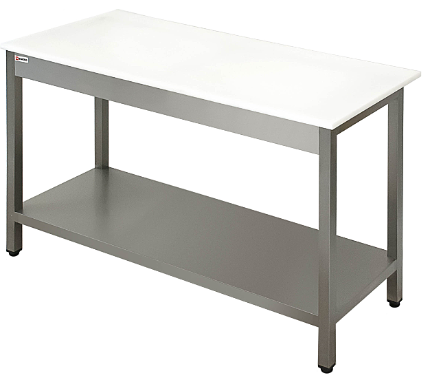 Столы разделочные используются для разделочных работ и в процессе приготовления полуфабрикатов. Выполнены из  высококачественной пищевой нержавеющей стали. Столешница -полипропилен 20мм.  Каркас - труба 40х40 мм, исполнение каркаса предлагается с обвязкой ножек или со сплошной полкой.