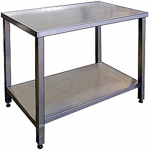 н/ст, толщина столешницы - 0,8 мм, разборная конструкция, каркас - оцинкованный уголок 40*40*1,5 мм, Hстолешницы -40 мм,без борта, столешница усилена ЛДСП толщиной 16 мм, регулируемые ножки(+/-10мм), отступ от края 60 мм