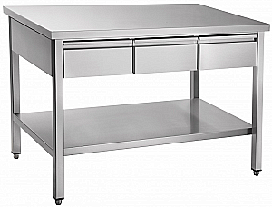 Столы имеют три выдвижных ящика размером 300х520х150 мм каждый, расположенные сбоку друг от друга, и регулируемые по высоте ножки с резиновыми вставками.