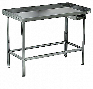 Стол имеет на столешнице три борта высотой 40 мм, лоток для сбора жидкости и отходов от обработки мяса. Сток жидкости в лоток осуществляется через отверстие в столешнице.