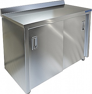 Стол-тумба может использоваться как обычный разделочный стол и одновременно для хранения посуды, кухонного инвентаря, сухих видов продуктов и столовых приборов. Стол-тумба имеет цельносварную конструкцию. Столешница изготовлена из пищевой нержавеющей стали, внутри столешницы ЛДСП. Внутри стола-тумбы основание и полка из пищевой нержавеющей стали, задняя стенка стола из нержавеющей стали. Раздвижные дверцы "купе" позволяют сэкономить пространство кухни при их открытии. Ножки стола снабжены регуляторами высоты, что позволяет устранять неровности пола. Изделие легко моется.