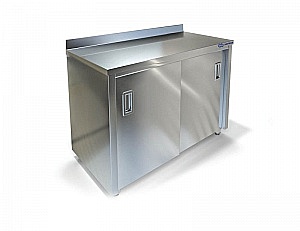 Стол-тумба может использоваться как обычный разделочный стол и одновременно для хранения посуды, кухонного инвентаря, сухих видов продуктов и столовых приборов. Стол-тумба имеет цельносварную конструкцию. Столешница изготовлена из пищевой нержавеющей стали, внутри столешницы ЛДСП. Внутри стола-тумбы основание и полка из пищевой нержавеющей стали, задняя стенка стола из оцинкованной стали. Раздвижные дверцы "купе" позволяют сэкономить пространство кухни при их открытии. Ножки стола снабжены регуляторами высоты, что позволяет устранять неровности пола. Изделие легко моется.