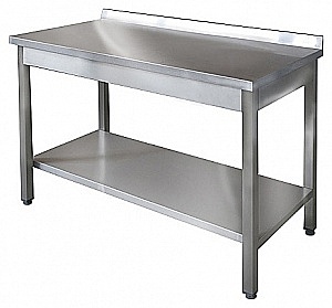 Стол пристенный с полкой изготовлен из нержавеющей стали AISI 430. Каркас - квадратная труба 40х40мм. Столешница усилена двойной ламинированной ДСП. Объемный борт. Жесткость полки обеспечивается ребром. Ножки регулируются по высоте. Стол имеет разборную конструкцию.