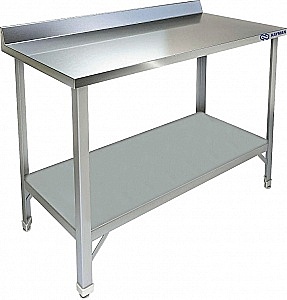 Стол на каркасе из уголка AISI430, столешница из AISI430 с бортом. Внизу сплошная полка-накладка из AISI430.