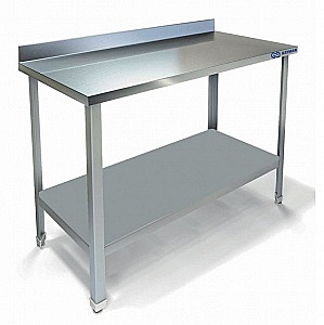 Стол на каркасе из уголка AISI430, столешница из AISI430 с бортом. Внизу сплошная полка-накладка из AISI430.
