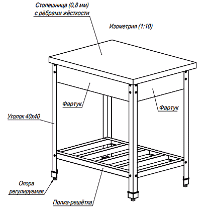 Разборный, без борта, столешница - нерж. сталь толщиной 0,8 мм., полка решетчатая из нерж. стали, столешница - с ребрами жесткости, фартуки нерж. с 4-х сторон, ноги - нерж. уголок 40х40х1,5, металл AISI 430, чертеж СП(Р) НУ-Р - СТАНДАРТ