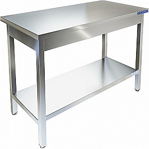 Стол производственный без борта, столешница из нержавеющей стали марки AISI 430 толщиной 0,8мм, ЛДСП толщиной 32мм. Каркас разборный из трубы 40х40 нержавеющей стали марки AISI 430 толщиной 1,2мм. Обвязка из трубы 40х20 нержавеющей стали марки AISI 430 толщиной 1,2мм. Регулируемые опоры. Стол поставляется в разобранном виде.