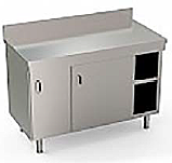 Стол с раздвижными дверцами из нержавеющей стали AISI 304. Рабочая поверхность с закругленными краями, усиленная нижняя полка, выдерживающая нагрузку 150 кг/кв.м при равномерном распределении по всей поверхности. Регулируемые по высоте ножки из нержавеющей стали AISI 304.