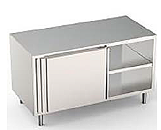 Нижний отсек с раздвижными дверями, нержавеющая сталь AISI 304, с промежуточной полкой. Регулируемые по высоте ножки из нержавеющей стали.
