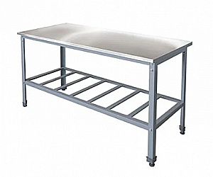 Стол центральный с полкой-решеткой. Каркас и полка-решетка выполнены из уголка углеродистой стали, окрашенного импортной порошковой краской. Столешница изготовлена из нержавеющей стали усилена двойной ламинированной ДСП. Ножки стола регулируются по высоте. Стол имеет разборную конструкцию.