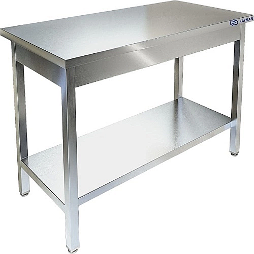 Столы производственные имеют широкую область применения: в пищеблоках, продовольственных магазинах, в цехах, связанных с переработкой пищевого сырья и т. д. Стол производственный имеет сборно-разборную конструкцию. Он состоит из столешницы и каркаса, изготовленного из нержавеющего уголка. Столы без борта устанавливаются в центре кухонного помещения и предназначены для четырёхстороннего доступа к рабочей поверхности. Столы укомплектованы сплошнойй полкой-накладкой. Ножки стола снабжены регуляторами высоты, что позволяет устранять неровности пола. В конструкции стола использованы элементы для придания устойчивости и предотвращения раскачивания во время эксплуатации. Универсальная конструкция позволяет легко производить сборку стола.