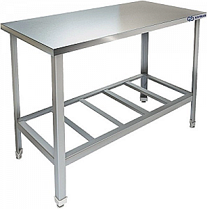 Столы производственные имеют широкую область применения: в пищеблоках, продовольственных магазинах, в цехах, связанных с переработкой пищевого сырья и т.д. Стол производственный имеет разборную конструкцию. Он состоит из столешницы, изготовленной из пищевой нержавеющей стали и каркаса, изготовленного из оцинкованного уголка толщиной 1.5мм. Столы без борта устанавливаются в центре кухонного помещения и предназначены для четырёхстороннего доступа к рабочей поверхности.