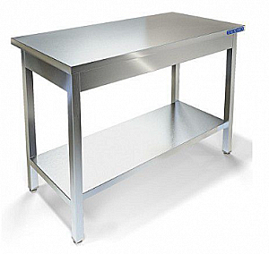 400х600х850мм, Стол производственный без борта, столешница из нержавеющей стали марки AISI 430 толщиной 0,8мм, ЛДСП толщиной 32мм. Каркас разборный из трубы 40х40 нержавеющей стали марки AISI 430 толщиной 1,2мм. Полка сплошная из нержавеющей стали марки AISI 430 толщиной 0,8мм. Регулируемые опоры. Стол поставляется в разобранном виде.