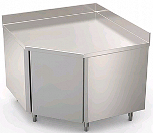 Стол угловой с распашными дверцами из нержавеющей стали AISI 304. Рабочая поверхность с закругленным краем с бортом, усиленная нижняя полка, несущая нагрузку 150 кг/кв.м при равномерном распределении по всей поверхности. Регулируемые по высоте ножки из нержавеющей стали AISI 304.