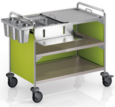 Мобильная уборочная станция с вырезом под контейнеры для отходов (2 шт. GN 1/3‑200) в верхней полке, с 4 косынками для жесткости каждой полки на 2 верхних полках,